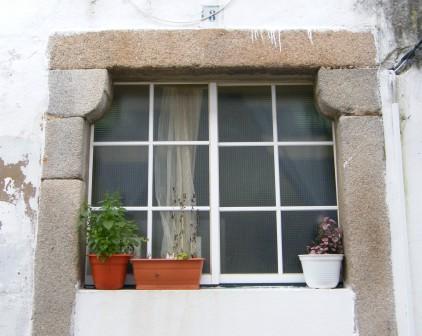 Janela que já foi porta, enquadrada por cantaria em granito e com vasos de plantas no parapeito. De notar que a placa com o número de polícia se mantém por cima da porta que se transformou em janela.